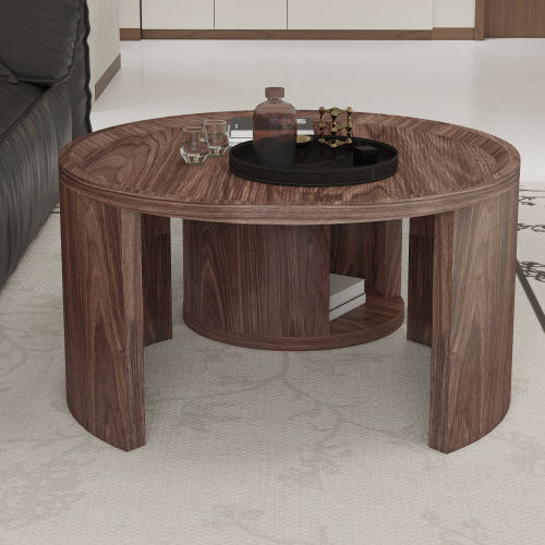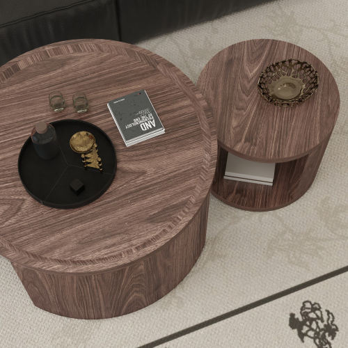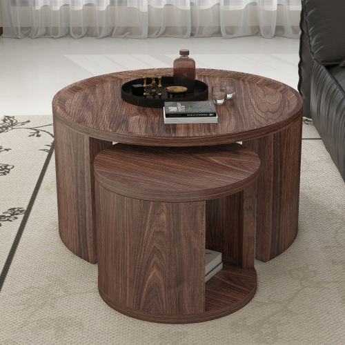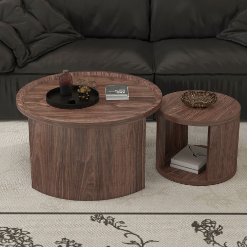 Modern Durable Round Nesting Coffee Table Set of 2 Natural Wood & Walnut MDF for Living Room & Bedroom