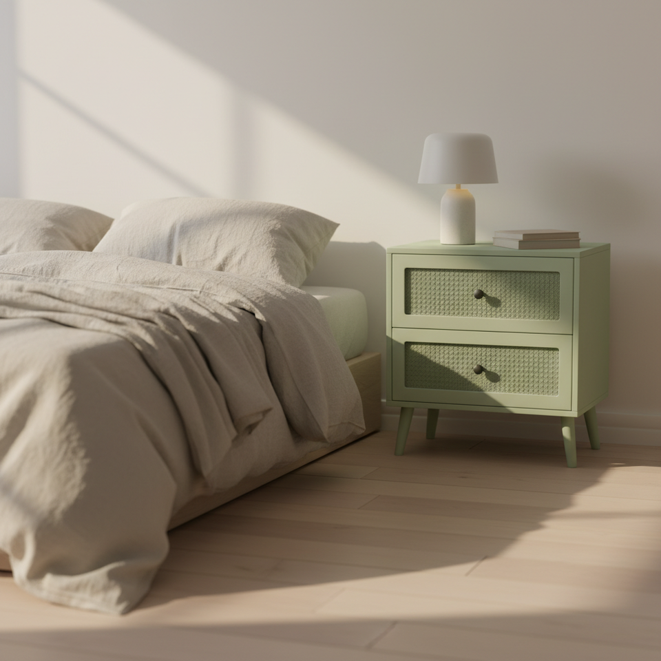 Modern Eco-Friendly 2-Drawer Rubber Wood & MDF Oak Veneer Side Table with Rattan Detailing Living Room Storage Table
