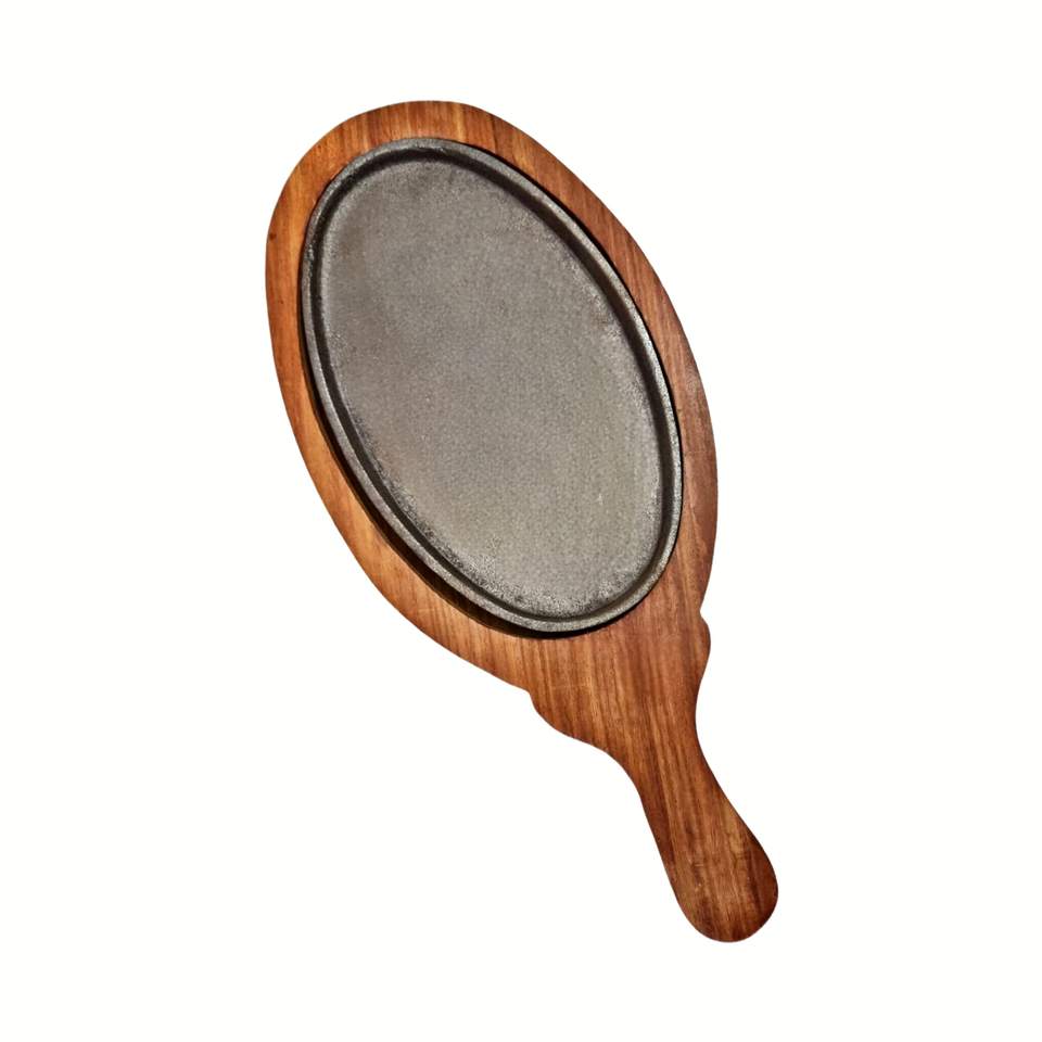 Modern Eco-Friendly Cast Iron Sizzling Plate with Wooden Base and Handle Handmade Best Quality Classic Design for Serving Pans