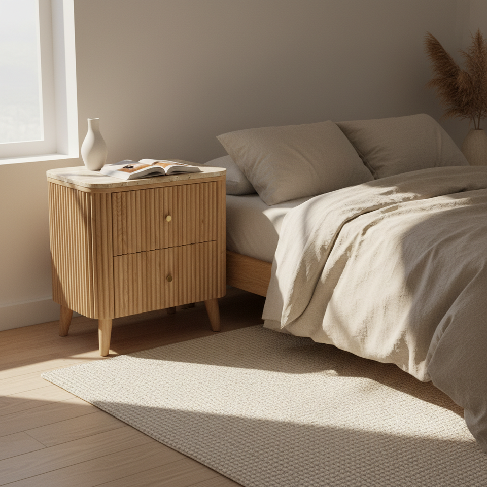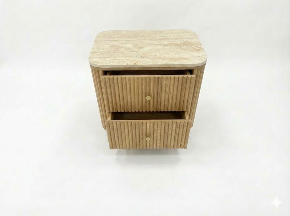 Modern Eco-Friendly Side/End/Bedside Table 2 Drawers Shutter Door Acacia MDF Oak Veneer Marble Top for Living Room Dining Spaces