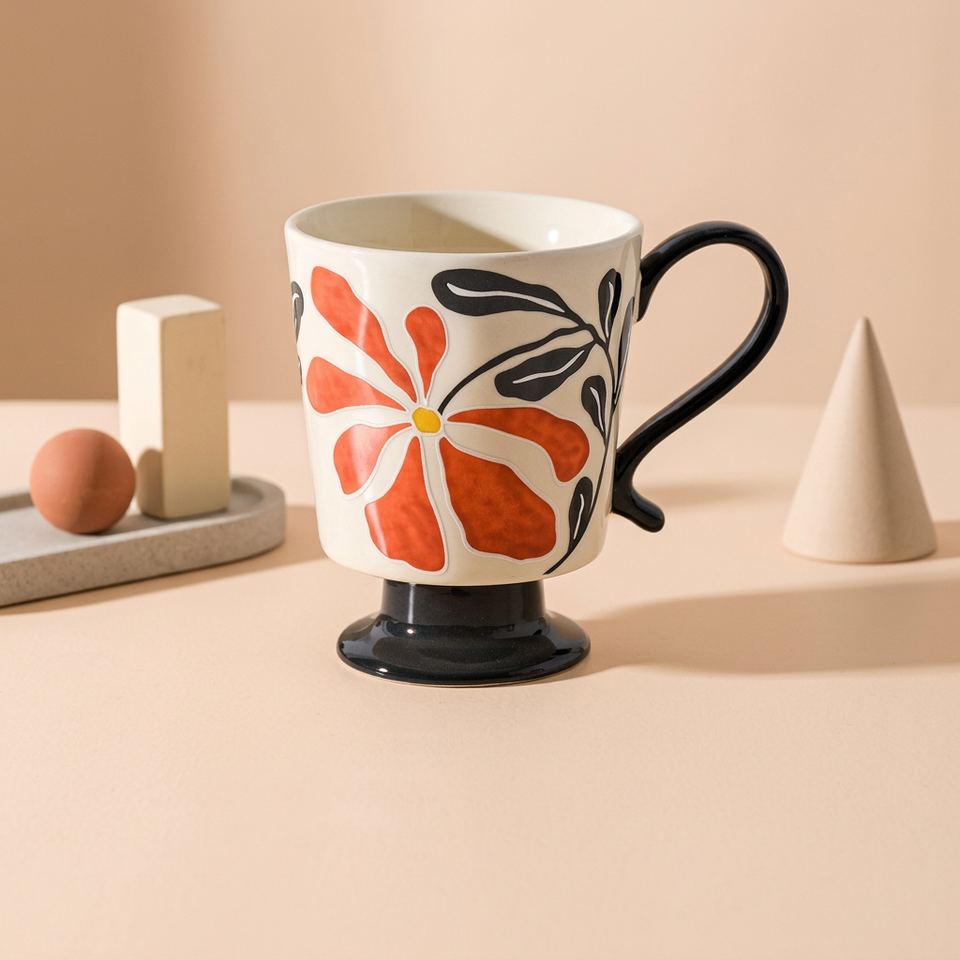 Modern Embossed High Temperature Resistant Ceramic Mug with Lid Spoon Handle Microwave Safe Floral Logo for Office Use