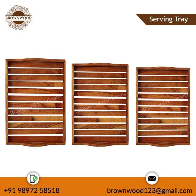 Modern European Natural Acacia Wood Handmade Rectangle Serving Tray Set of 3 for Quality Food Drink Hotel Use