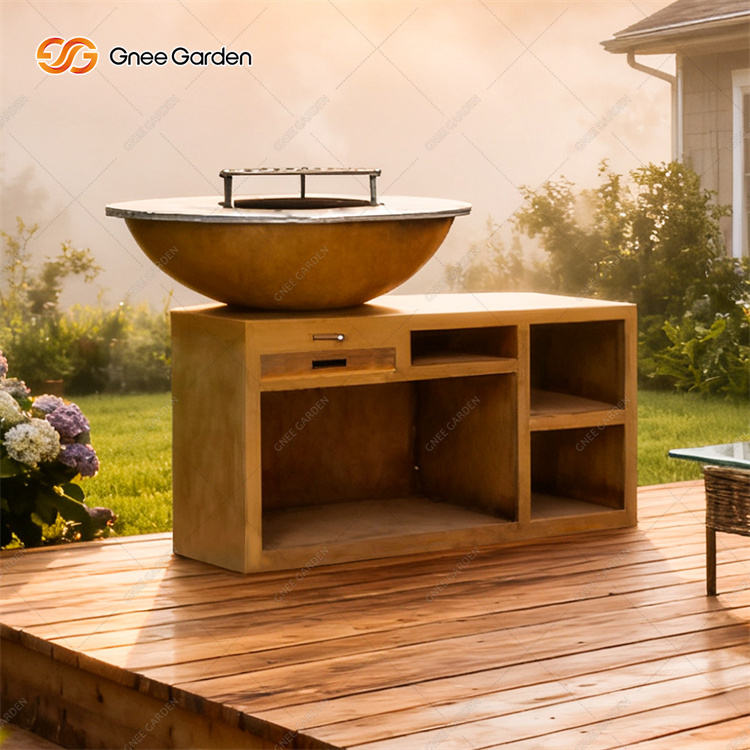 Modern European-Style Corten Steel BBQ Grill Wood-Burning Fire Pit with Large Cooking Area and Log Storage Space