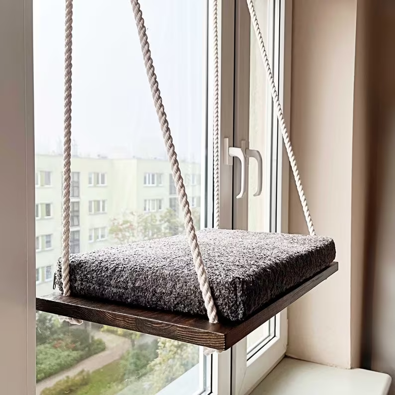 Modern Farmhouse Pine Wood Geometric Cat Window Movable Disassembled Design Plush Bed Hammock Horizontal Pattern Engraved