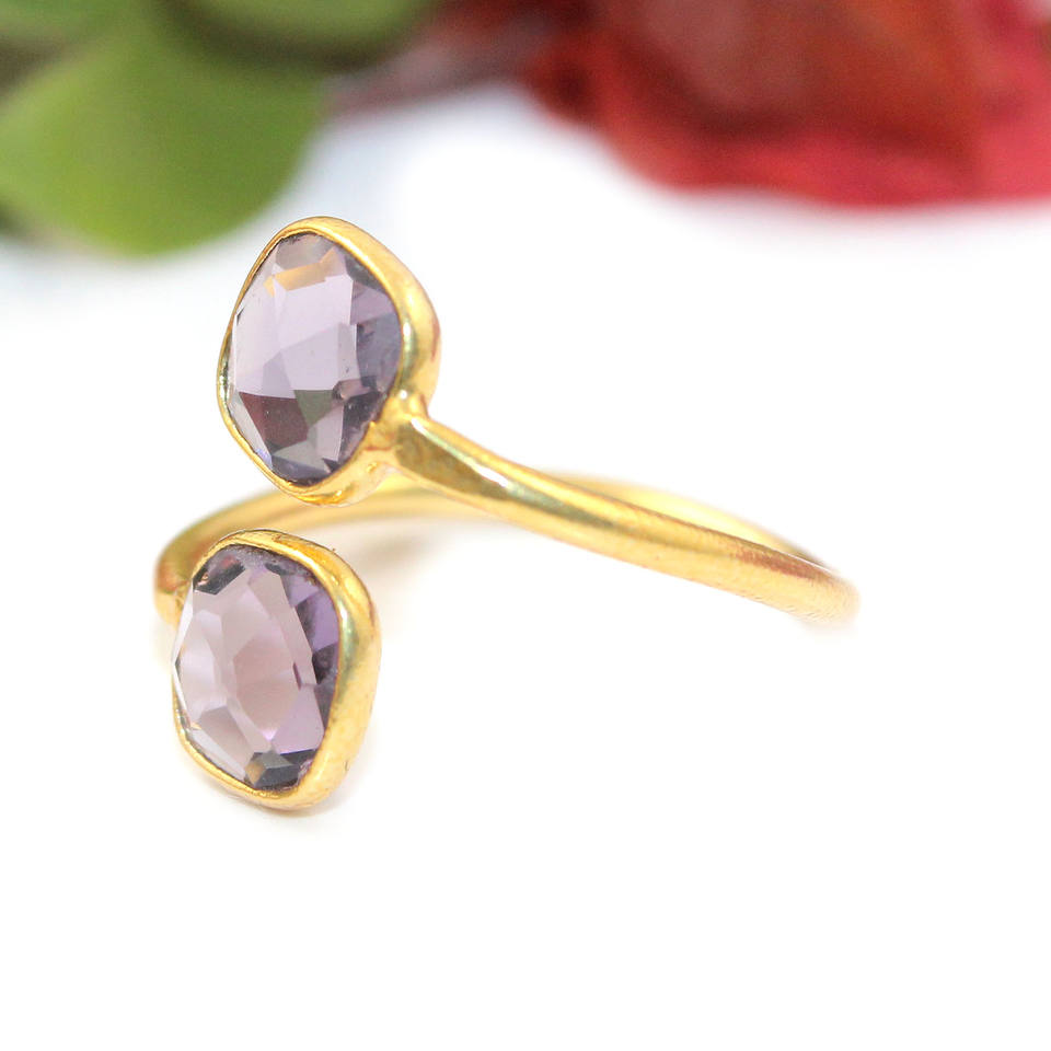 Modern Fashion Amethyst Cushion Shape Hydro Quartz Double Stone 24K Gold Plated Designer Free Size Ring Womens Wholesale Jewelry