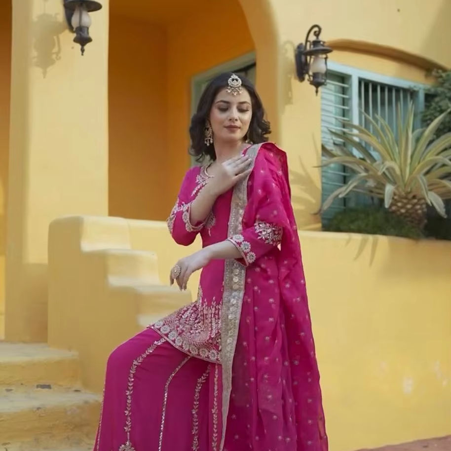 Product Name:Chinon Silk Sequence Embroidery Work Top & Sharara With Dupatta
