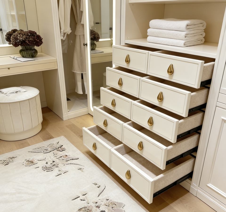 Modern French White Walk-In Closet - Arched Gold Trim & Mirror Doors, LED Lighting, Vanity for Luxury Home