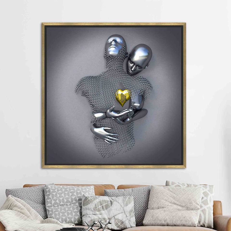 Modern Glass Wall Art: Silver Hugging Couple, Gold Heart Canvas Print,GOLD FRAMED CANVAS