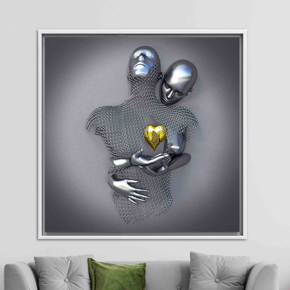 Modern Glass Wall Art: Silver Hugging Couple, Gold Heart Canvas Print,WHITE FRAMED CANVAS