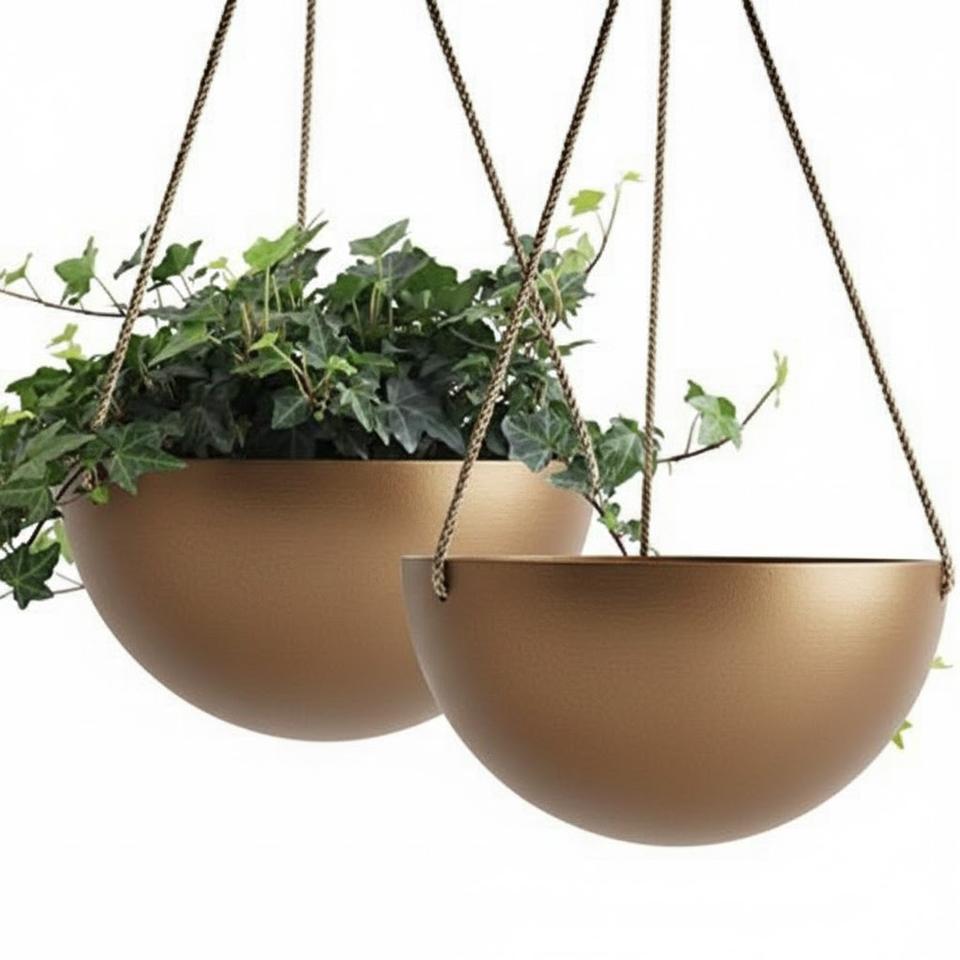 Modern Gold Metal Hanging Planter Bowl With Long Chain Indoor Outdoor Ceiling Wall Decor Flower Pot For Home Garden Balcony