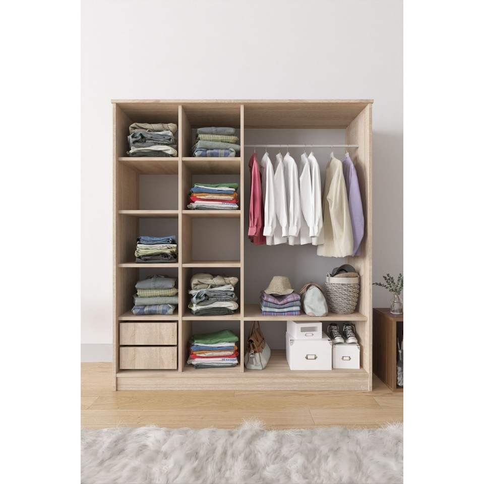 Modern Gray Zambak Freestanding Wardrobe 2-Door Closet with 11 Shelves and 2 Drawers for Bedroom Storage in Hotels