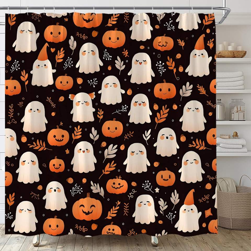 Modern Halloween Ghost Shower Curtain with Cute Pumpkin Spooky Retro Leaves Design Polyester Home Decor for Bathroom in Stock