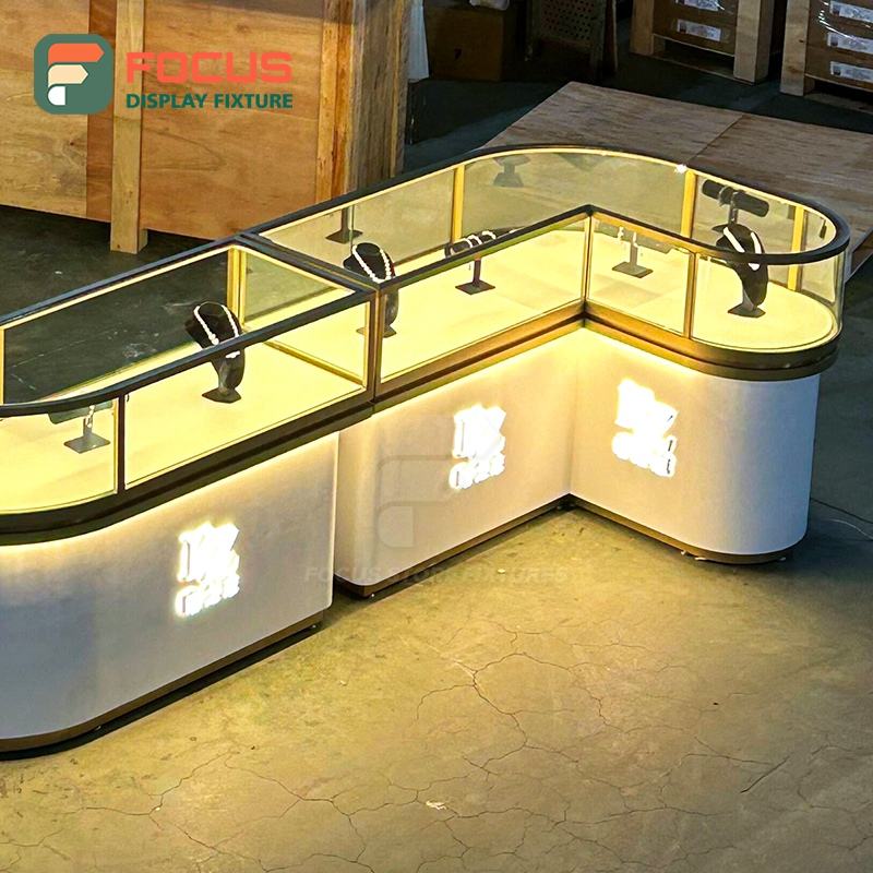 Modern High-End Glass Jewelry Display Cabinet Metal Wooden LED Lighting Retail Boutique Showcase Interior Display Stand