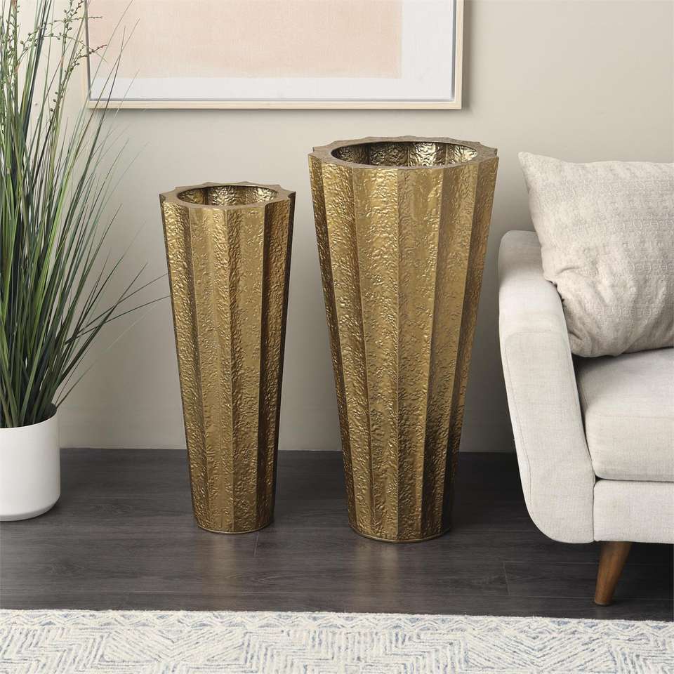 Modern High Quality Handmade Gold Metal Tall Textured Hammered Floor Vase 33\" 30\" H Iron Wholesale Price Home Decoration Set 2