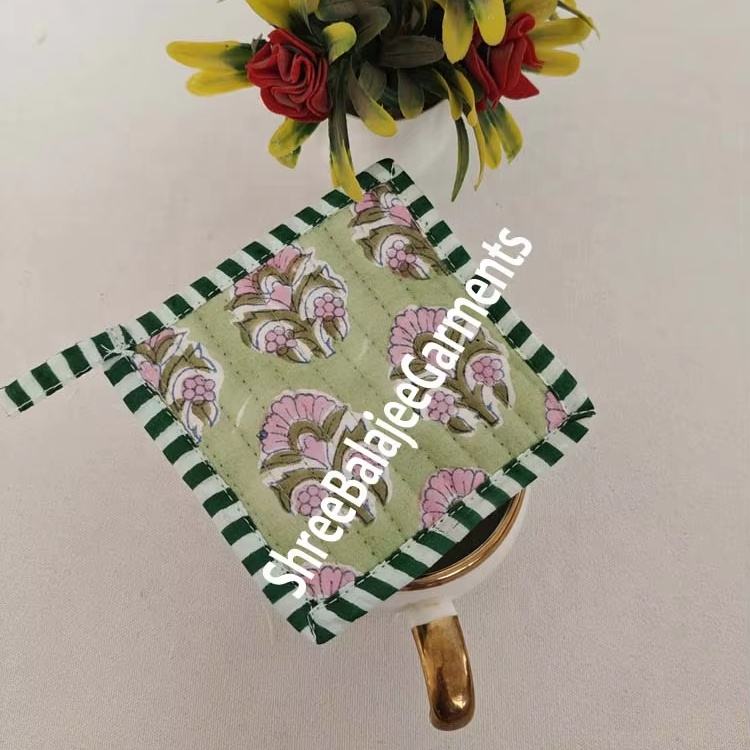 Modern Home Table Mats Light Green Reversible Hand Block Printed Cotton Quilted Piping Edge for Tea Coasters Home Furnishing