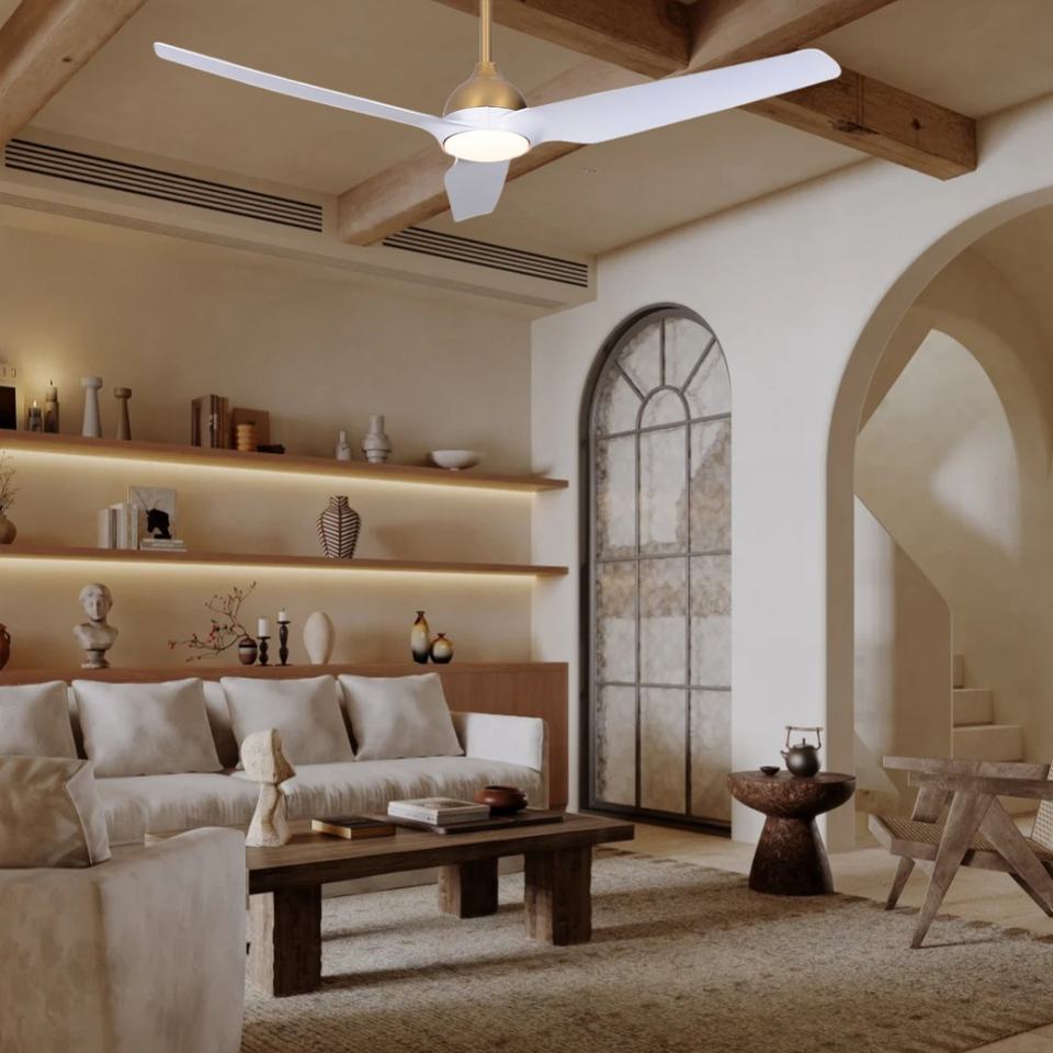Modern Inch ABS Ceiling Fan with Wood Color Black Blades and White Motor Remote Control with Lamp DC Motor