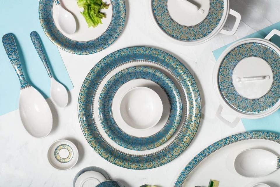Modern Elegant Indian Dinnerware Set Reusable BPA Free Porcelain Ceramic Spoon Bowl Dish Plate Collection Microwave Safe