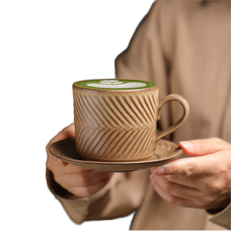 Modern Japanese-Style Embossed Ceramic Coffee Cup and Saucer Set Creative Latte Art Mug for Afternoon Tea