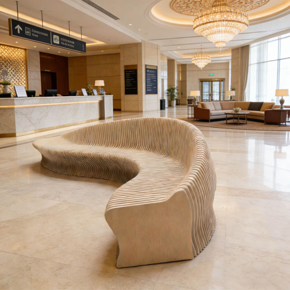 Modern L-Shape Sliced Wood Bench for Hotel & Supermarket Shopping Mall-Eco-Friendly Commercial Waiting Furniture