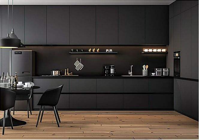 Modern L shape modular kitchen with glossy cabinets premium lighting marble finish countertop and luxury interior design