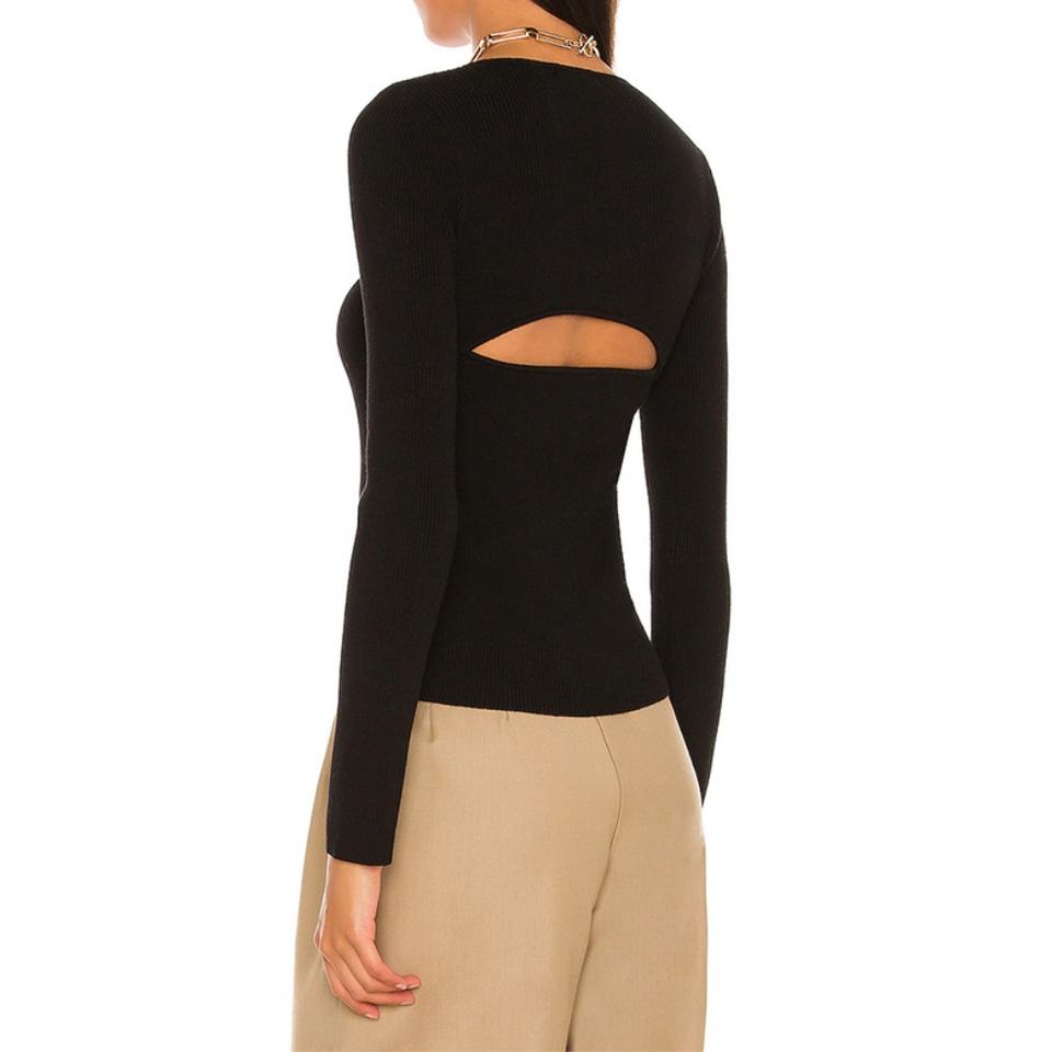 Modern Ladies Long Sleeves Sexy V-Neck Cut Out Sweater Top Black Ribbed Knit Women Top