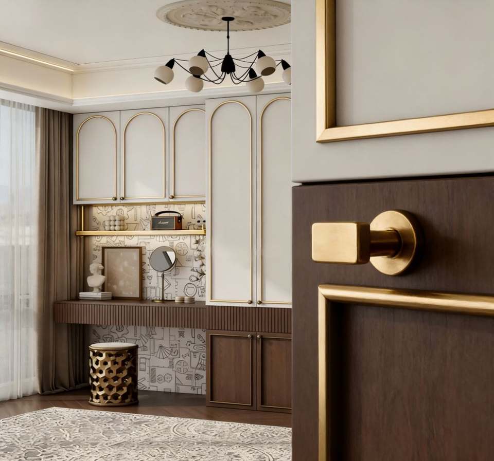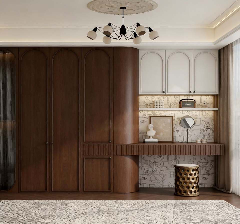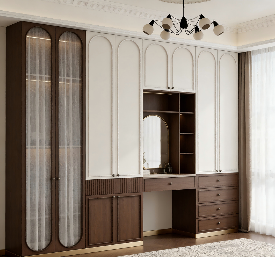 Modern Luxury Bedroom Wardrobe with Arched Glass Door & Built-In Dressing Table