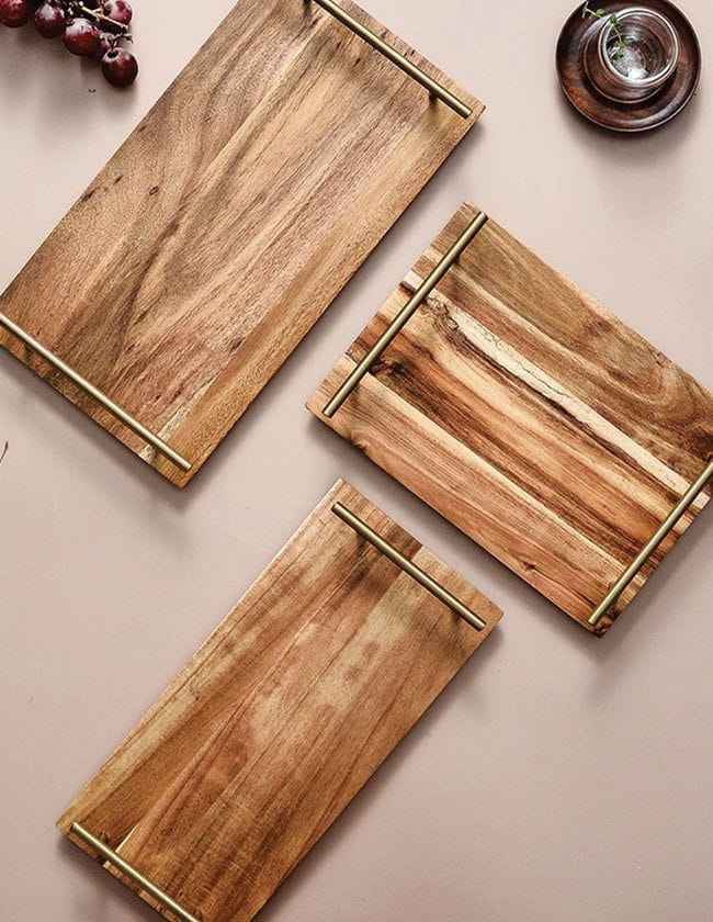 Modern Luxury Large Wooden Serving Tray with Elegant Metal Handle Handcrafted for Elegant Table Decoration