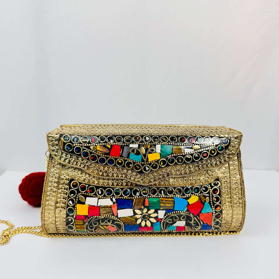 Modern Luxury Antique-Style Ladies Evening Clutch Bag Handmade Mother Pearl Metal Mosaic Gold-Plated Sculpture Multicolor Indian