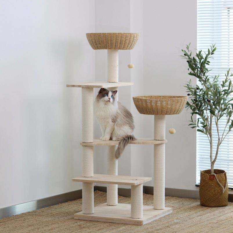 Modern Luxury Log Color Rattan Cat Tree Condo Sisal and Plastic Scratching Post with Bed Halloween Carton Packed