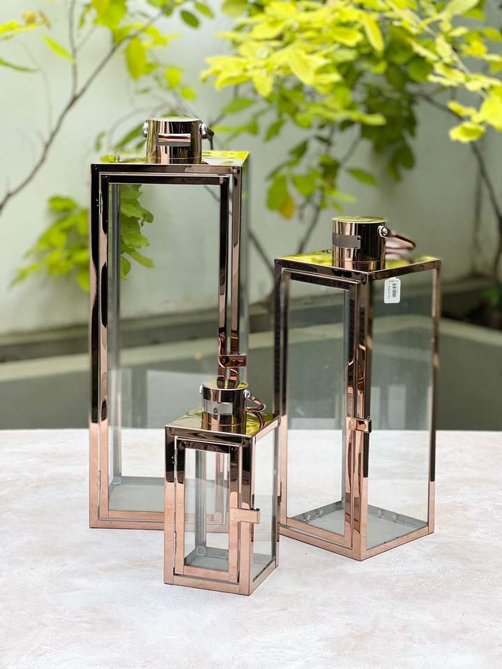 2025 Hot Selling Glossy Rose Gold Stainless Steel Glass Modern Handmade Square Shape Christmas Candle Holder Lanterns Set 3 Home