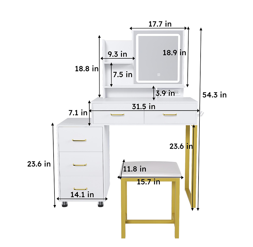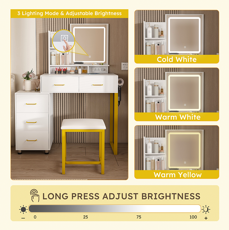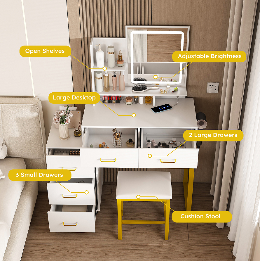 Modern Makeup Vanity Table with LED Lights & 3-Color Power Outlet 5 Drawers Sturdy Metal Legs & Chair for Bedroom/Living Room