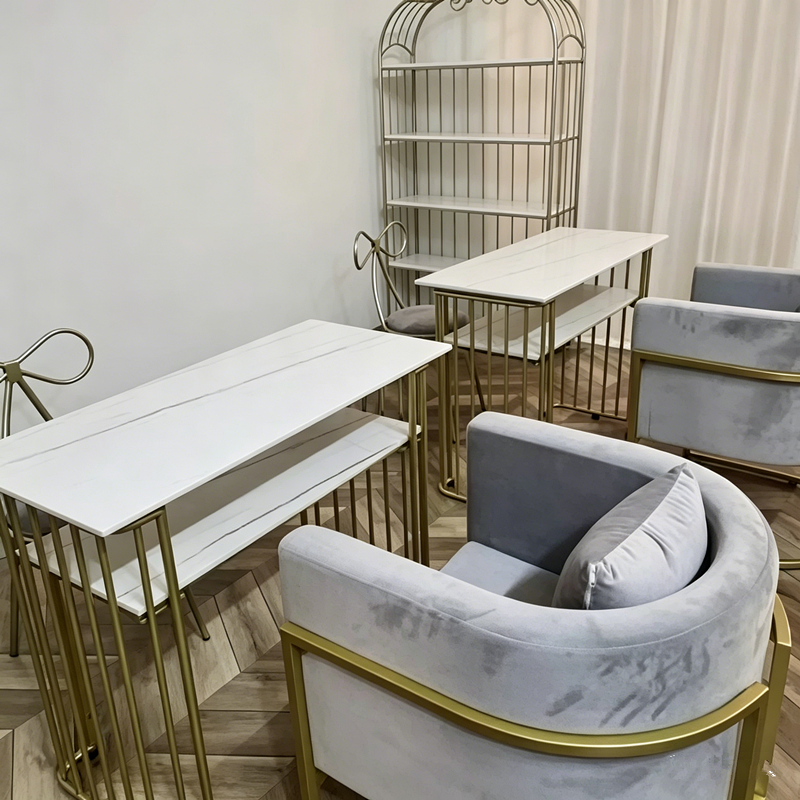 Modern Marble Manicure Table Set with Pink Velvet Chair and Gold Frame for Nail Beauty Salon Furniture
