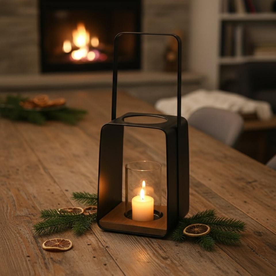Modern Matte Black Metal Lantern Candle Holder with Glass Hurricane and Wood Base Minimalist Decorative Outdoor Garden Lantern