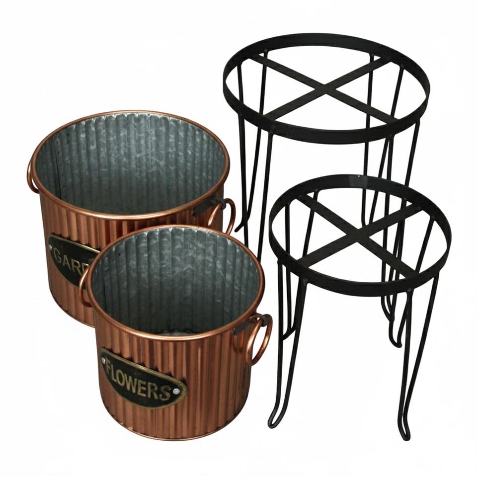 Modern Metal Planters With Wood Stands Bronze Color Finish Decorative Flower Pots With Teak Wood Stands For Garden Balcony Decor