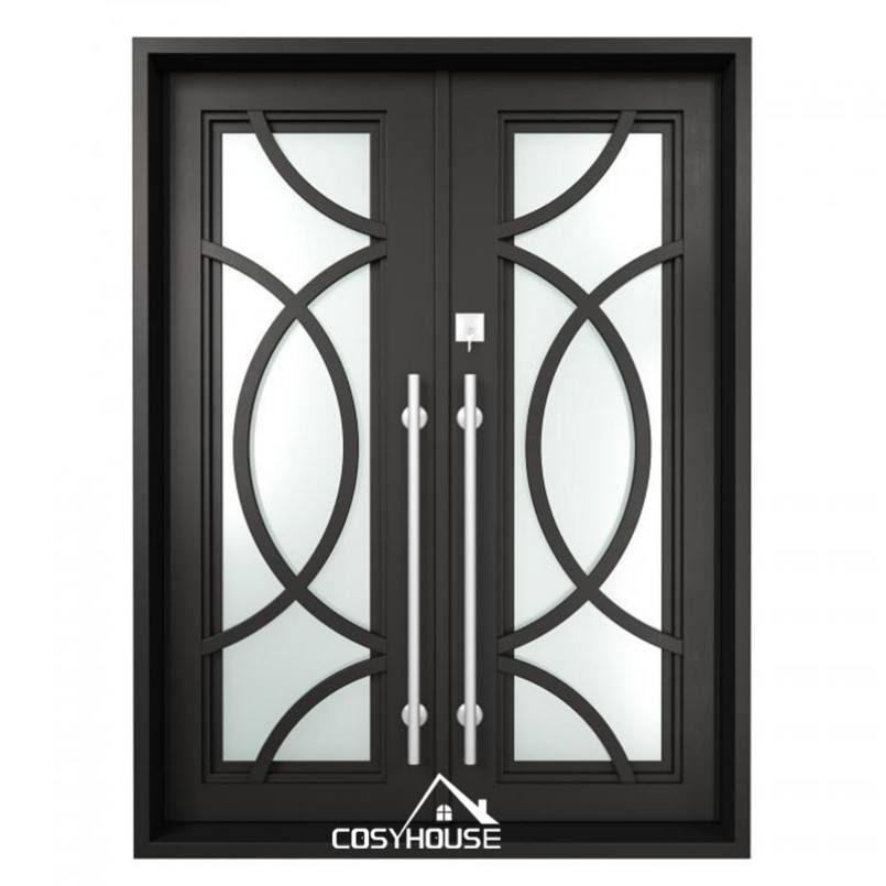 Modern Minimalist Black Wrought Iron Glass Anti-Theft Double Entry Doors for House Villa Apartment Hotel