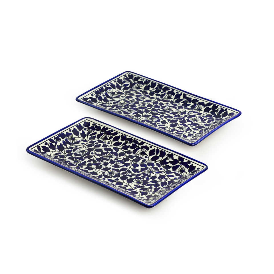Modern Navy Blue & White Hand-Painted Ceramic Serving Platter Set of 2 for Weddings and Diwali Festivities