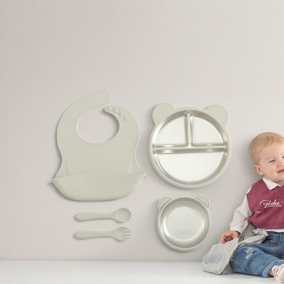 Modern New Design Children's Dining Tableware 304 Stainless Steel with Silicone Plate Bowl Suction Cup Cute Bear Spoon Fork Set