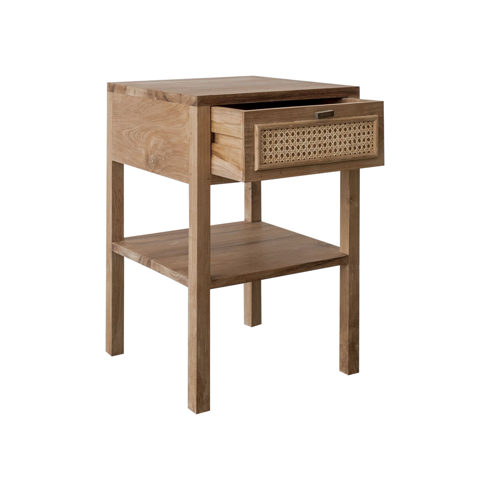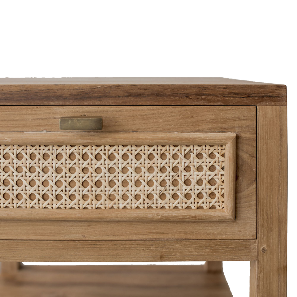Modern Nightstand with One Drawer and Made of Solid Teak Wood Frame with Rattan Woven and High Quality Material for Indoor Use