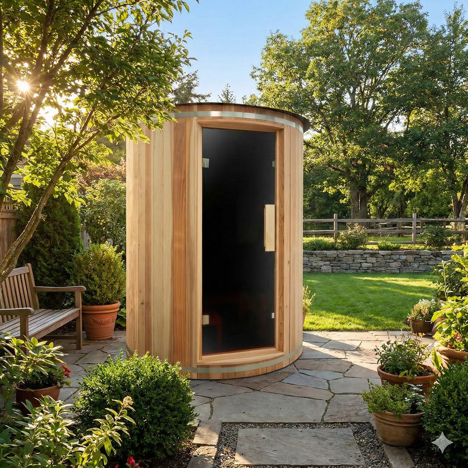 Modern Outdoor Spa Japanese Cedar Barrel Sauna Chromotherapy Lighting Waterproof Roof Traditional Sauna Stove Solar Powered