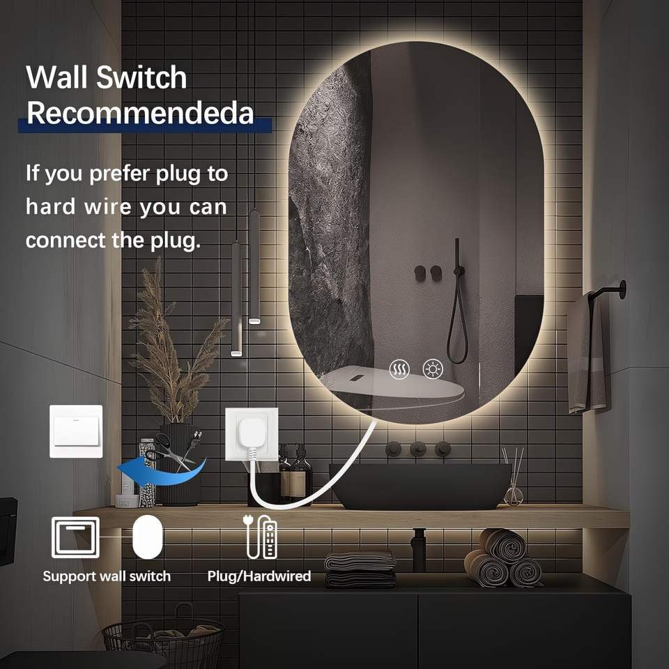 Modern Oval LED Bathroom Vanity Mirror Frameless Backlit Smart Anti-Fog Waterproof Memory Function Dimmable Lighted Mirror