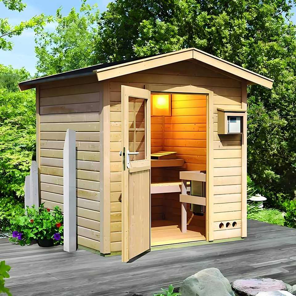 Modern Panoramic Outdoor Sauna and Salt Room Manufacturer Exporter Solid Hemlock Wood Electric Wet Steam Heating for Villas