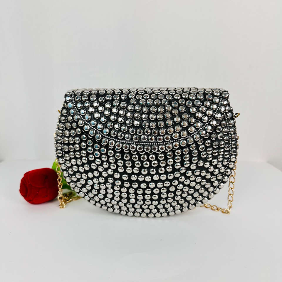 Modern Polished Silver Dot Metal Clutch Purse Festival Ethnic Wedding Sling Bag with Antique Bridal Metal Frame Compact Elegant