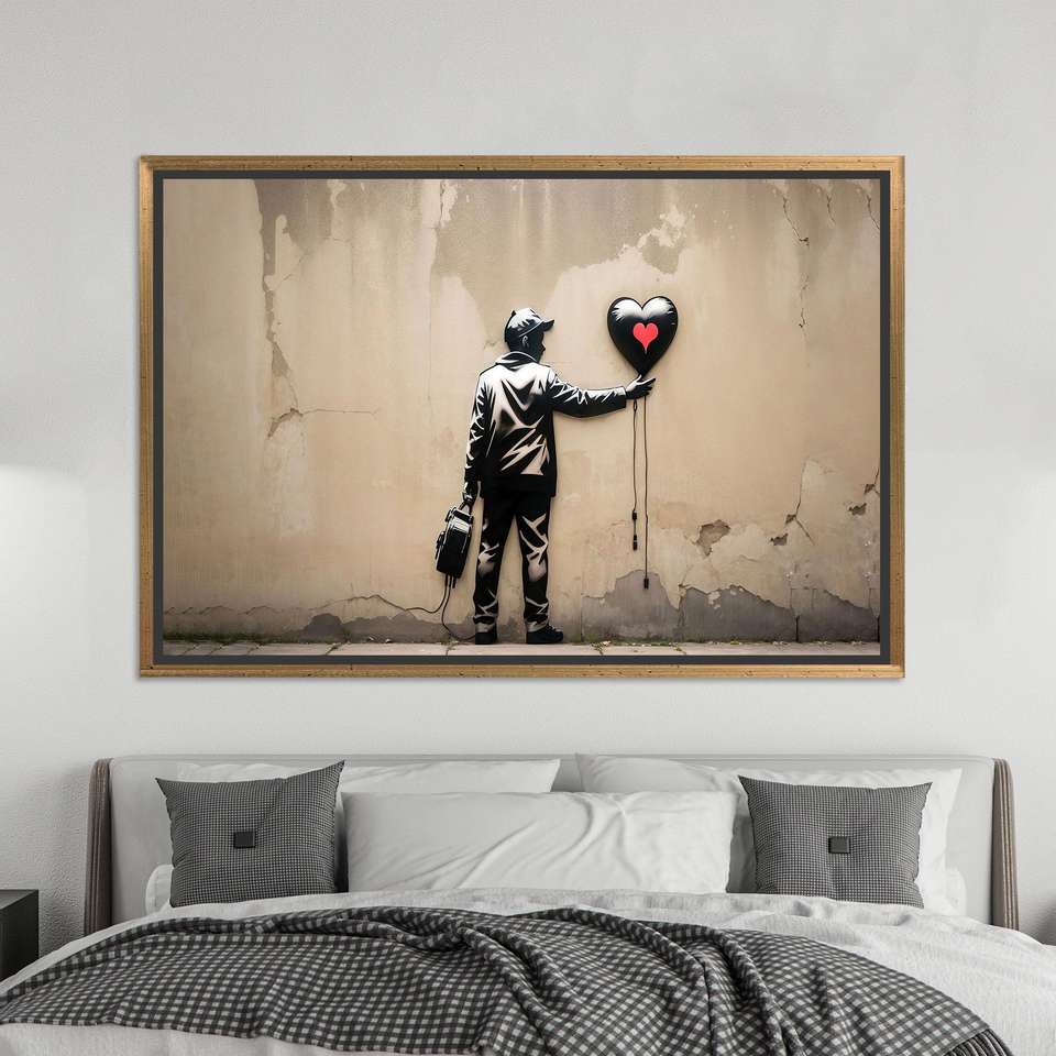 Modern Printed Canvas: Boy with Balloon Graffiti Art,GOLD FRAMED CANVAS