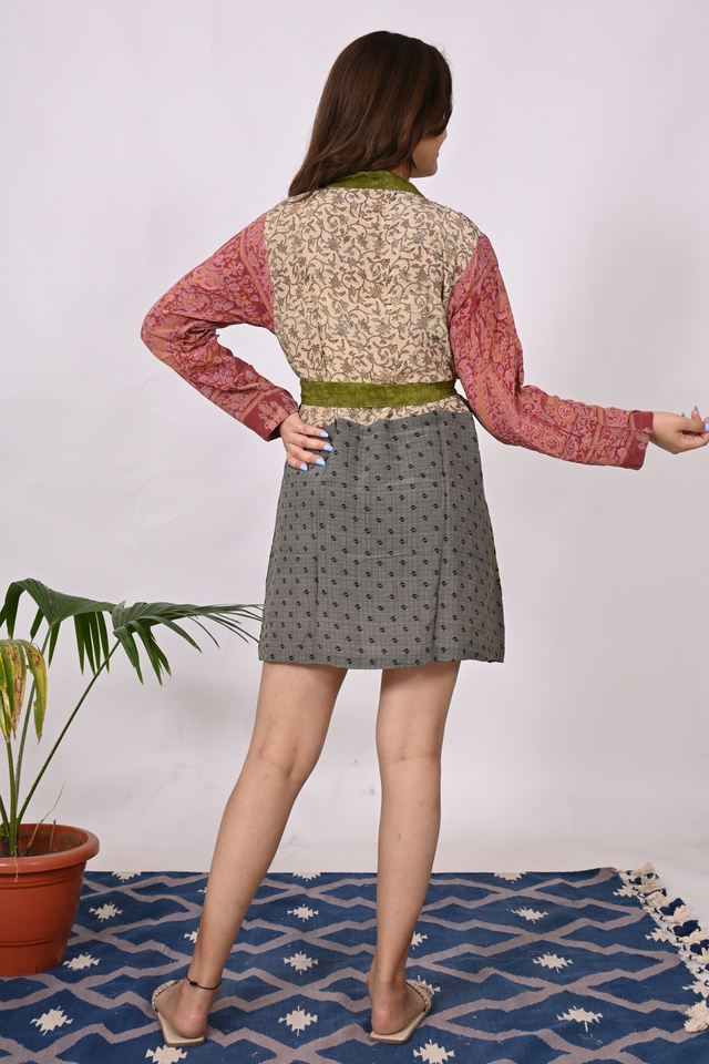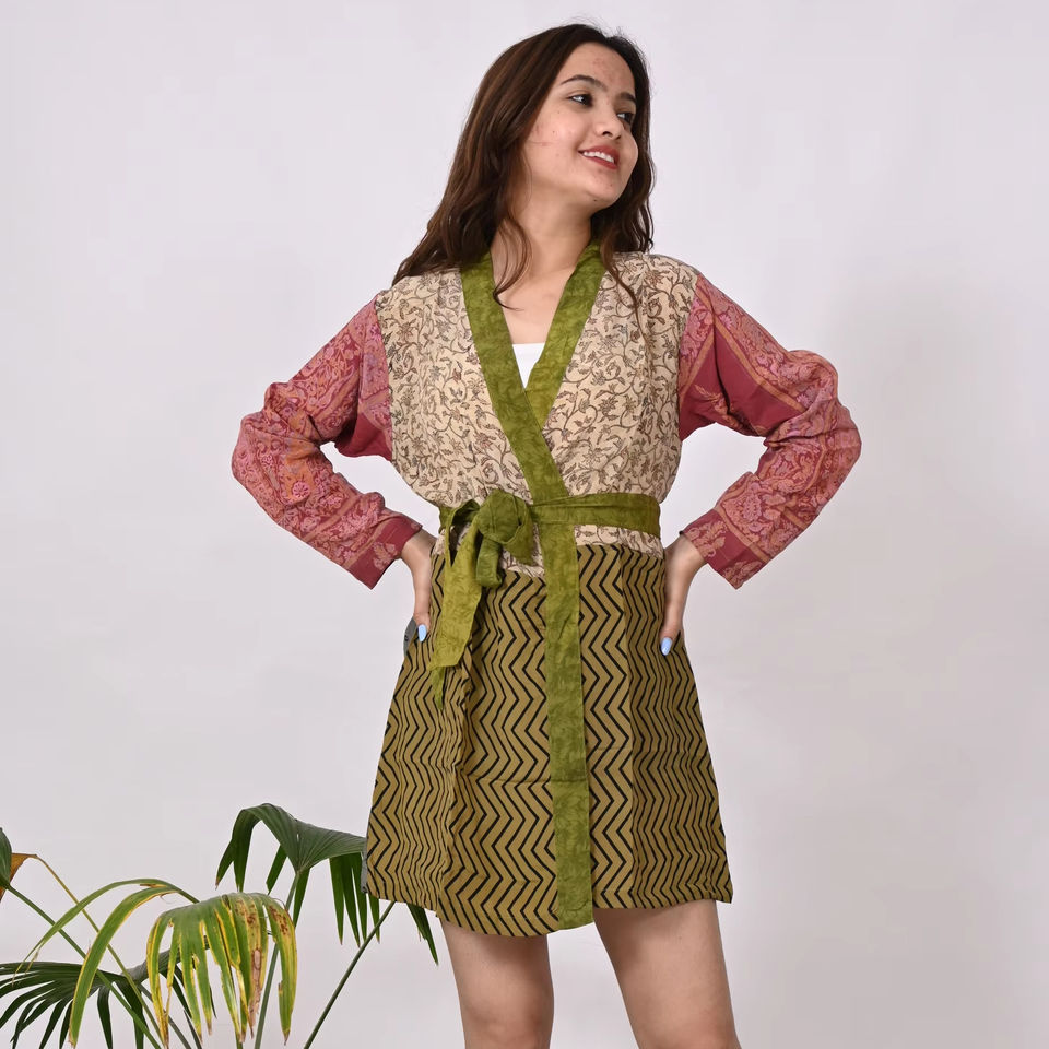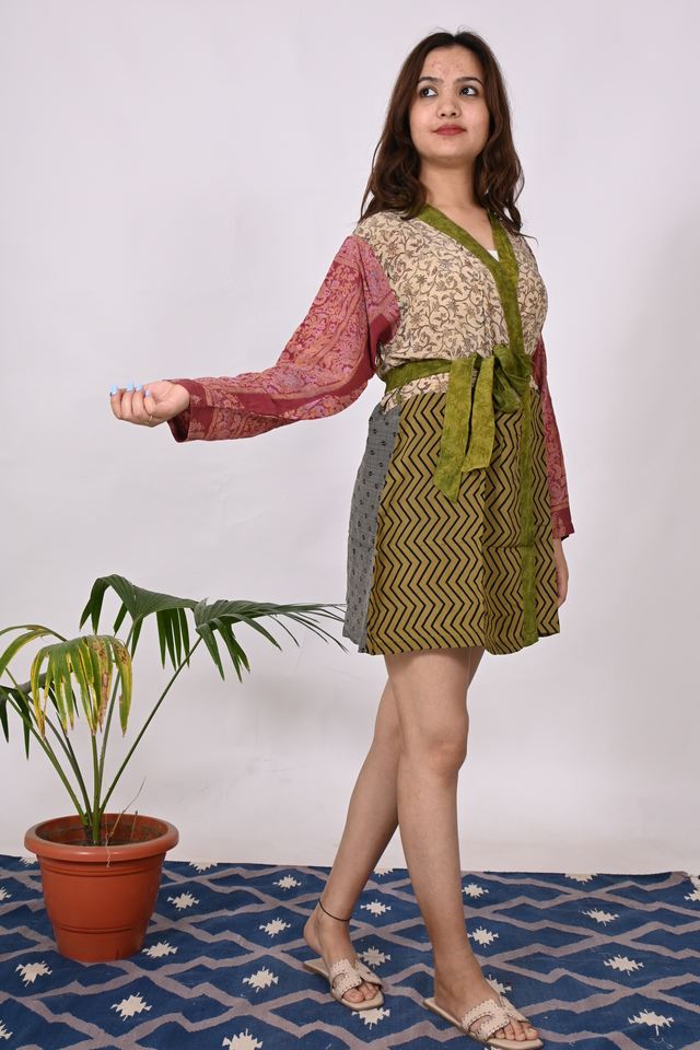 Modern Printed Silk Mini Dress for Plus Size Women Handmade V-Neck Style Long Sleeve Natural Waistline Woven Mini Silk Dress