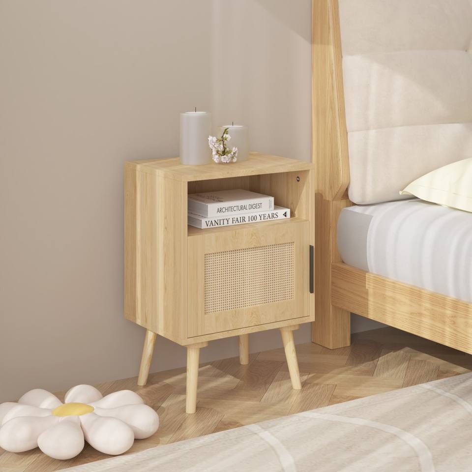 Modern Rattan Nightstand with Door Open Shelf and Solid Wood Legs Eco-Friendly Durable Bedroom Furniture for Small Spaces