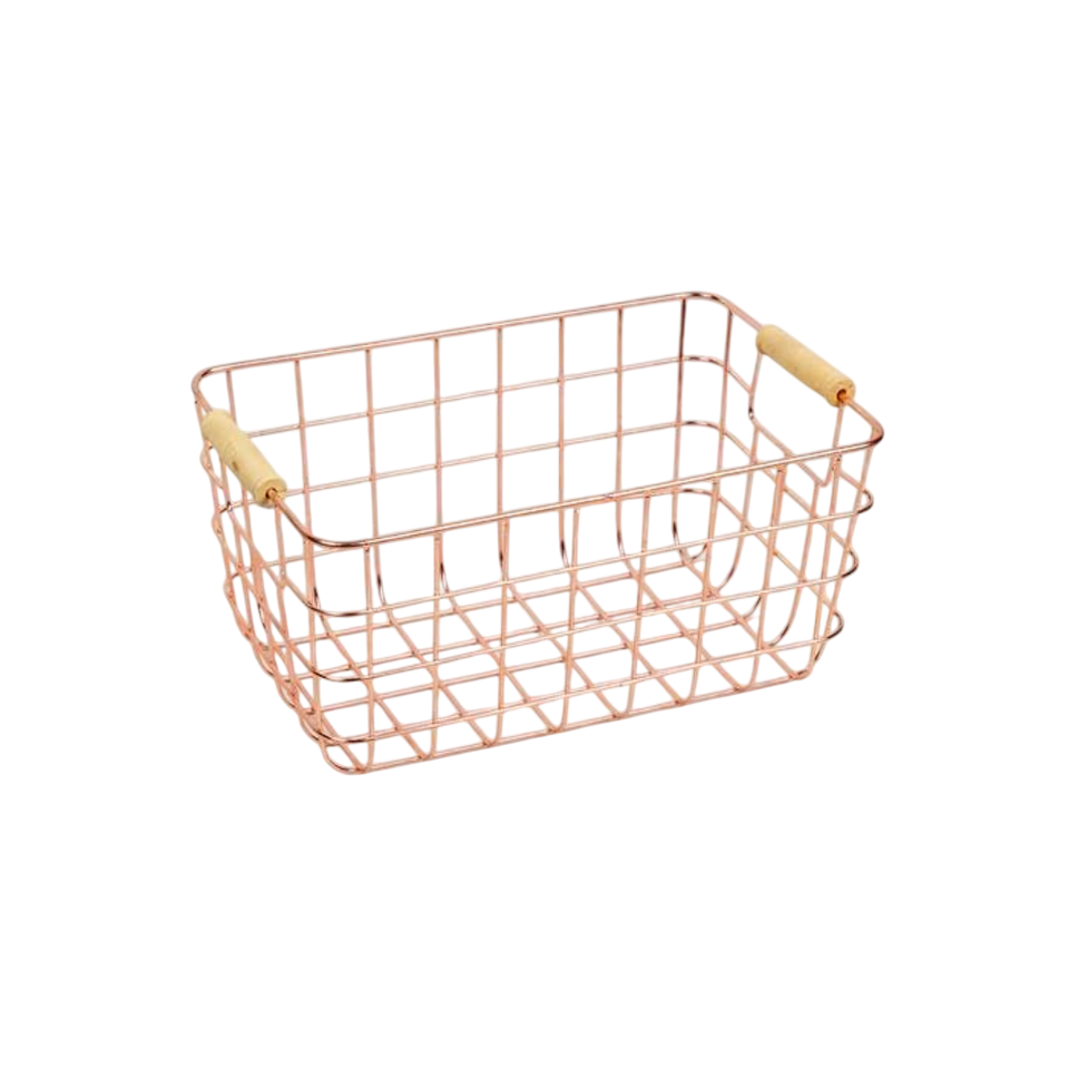 Modern Rectangular Rose Gold Metal Wire Storage Basket With Wooden Handles Iron Pantry Organizer Bin For Kitchen Bathroom & Home