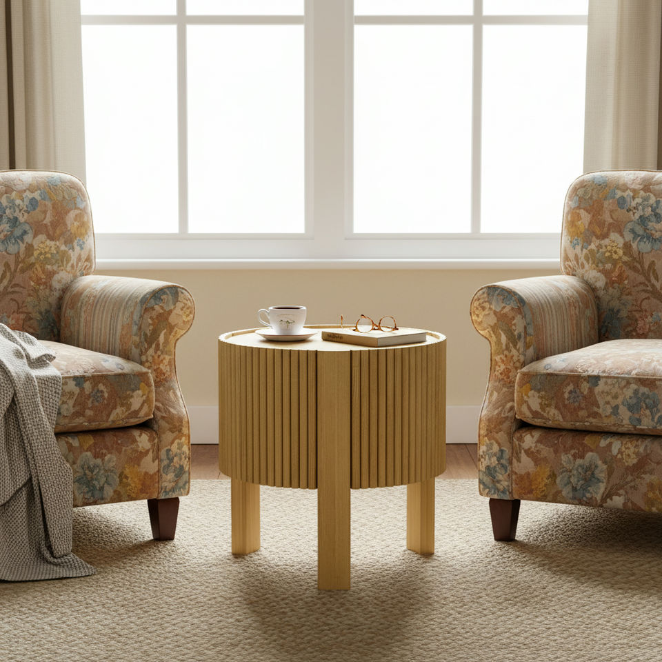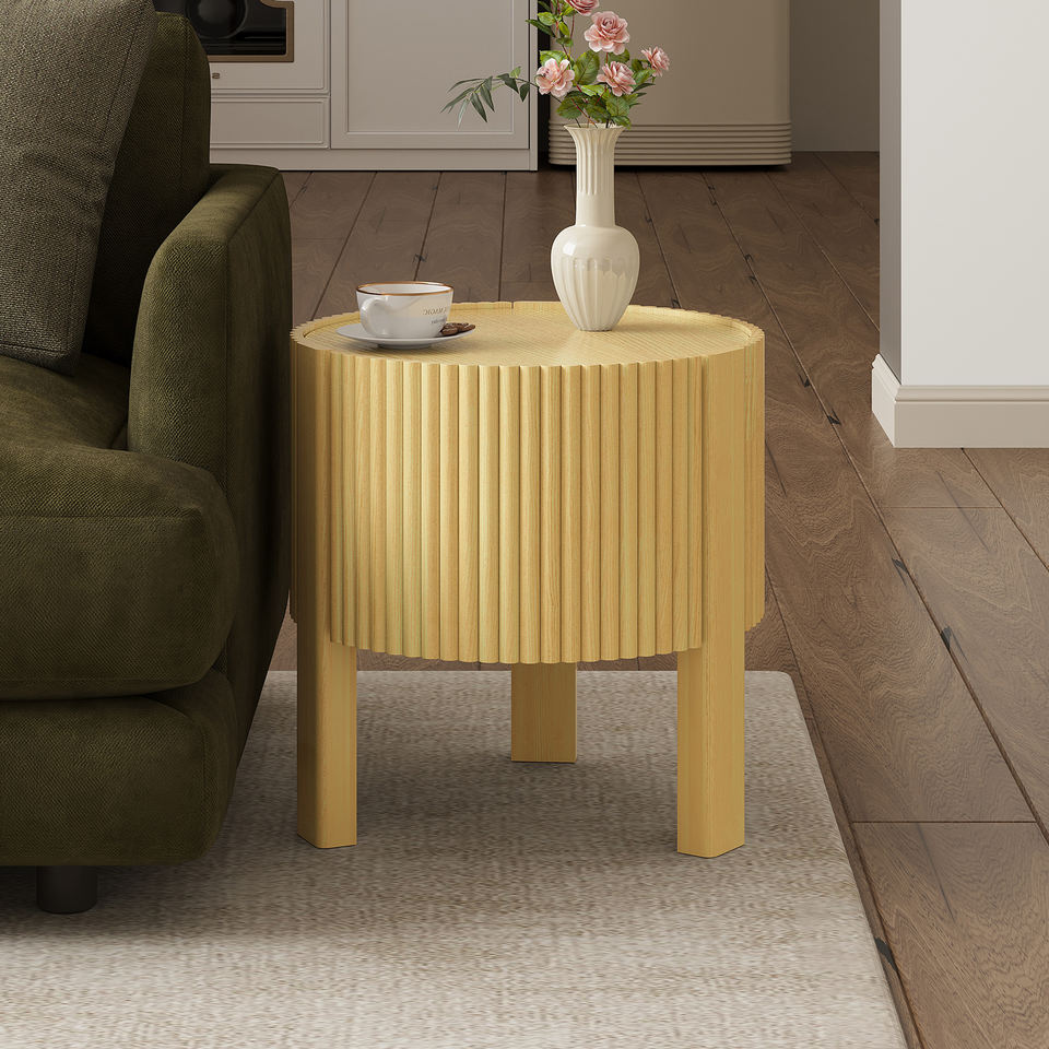 Modern Round Fluted Side Table with Storage for Living Room Rubber Solid Wood Soft-close Door Adjustable Height