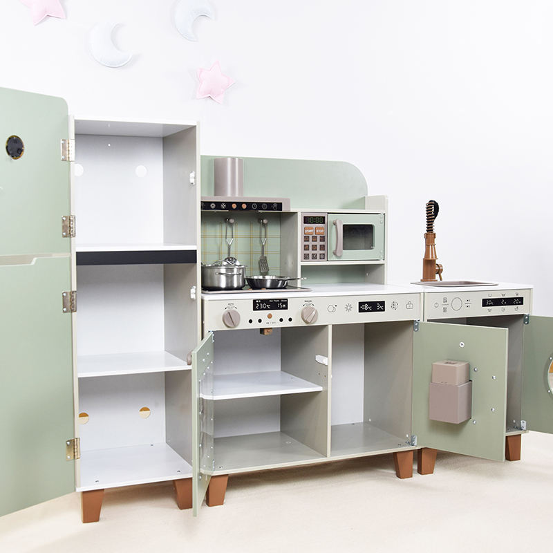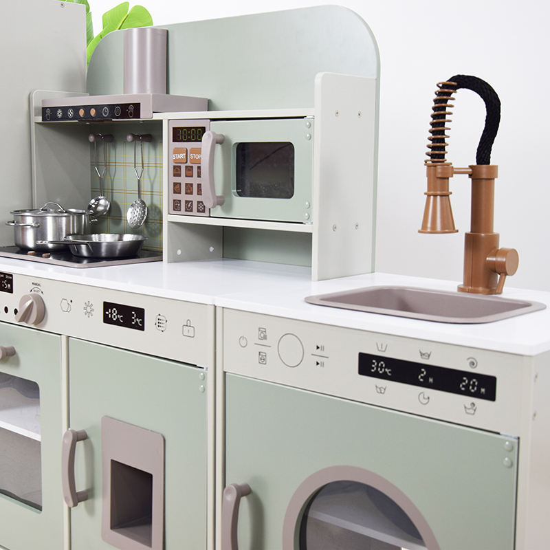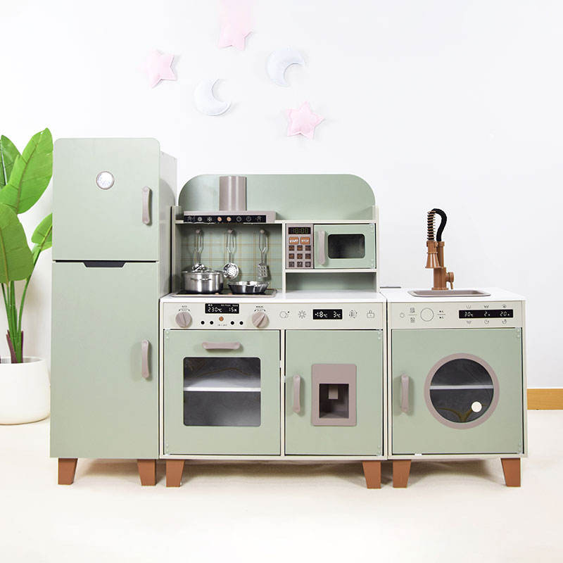 Modern Sage Green Wooden Kids 3-in-1 Kitchen + Fridge + Laundry Play Set with Oven, Microwave, Sink and Faucet