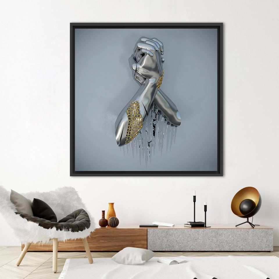 Modern Silver Metallic Hand Art Printed Canvas - Sleek Wall Decor,Black Framed