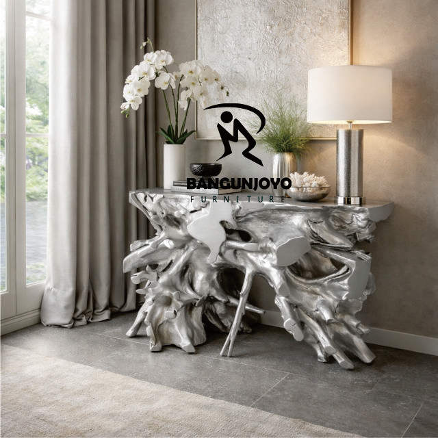 Modern Solid Teak Wood Root Console Table with Storage for Living Room